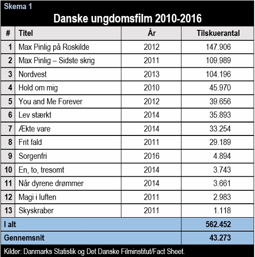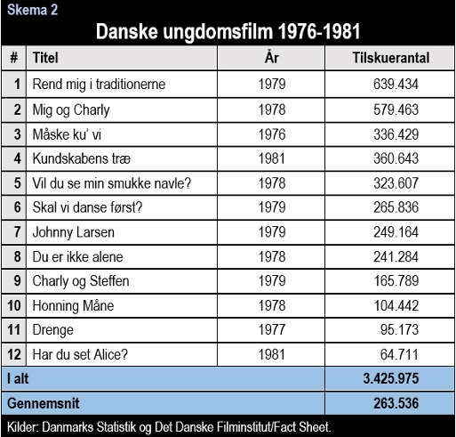 Skema 2 viser alle ungdomsfilmene fra genrens syvårige glansperiode fra 1976 til 1981. Dengang blev ungdomsfilm set af gennemsnitligt 263.536 tilskuere. Altså var den folkelige opbakning til danske ungdomsfilm hele seks gange så stor i forhold til i dag.