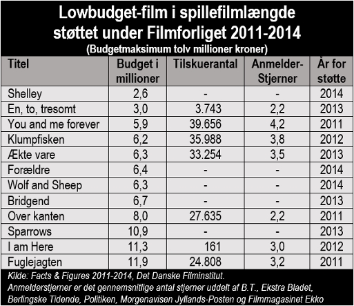 Alt dette til trods bliver det postuleret, at der ”er gode erfaringer med lowbudget-film i Danmark”. Det var pokkers. Alle succeseksemplerne ligger forud for den økonomiske krise, inden publikum for alvor mistede interessen for originale historier. Og i øvrigt kostede de succesfulde eksempler på lowbudget-film dobbelt så meget, som det højest fastsatte budget tilladt i det nye filmforlig.