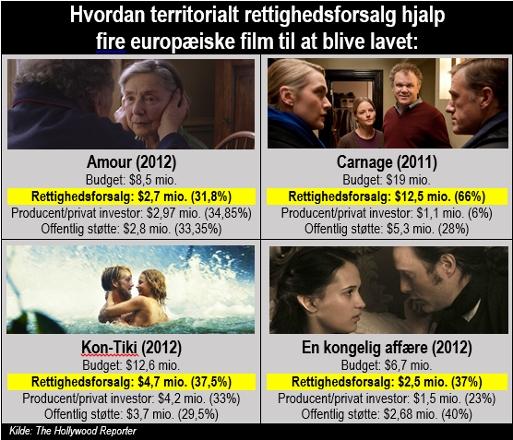 Både Lars von Trier, Mike Leigh og Pedro Almodovar er afhængige af dette ”forsalg” af deres film, for at de overhovedet kan blive lavet. Mellem 30 og 60 procent af en films budget finansieres gennem dette forsalg.
