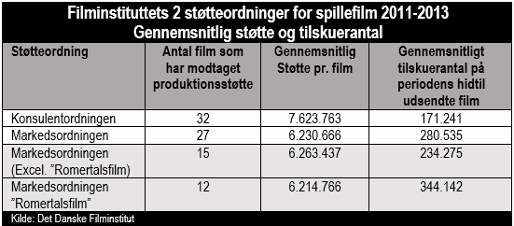 Når man sammenregner de totale støttebevillinger (både manuskript-, udvikling- og produktionsstøtte) i de to støtteordninger, er der ligeledes en betydelig skævhed. Konsulentordningen sidder på 62 % af støttemidlerne, Markedsordningen på kun 38 %, hvoraf romertalsfilm (fortsættelser som Far til fire – til søs, Min søsters børn i Afrika og Alle for to) belægger sølle 16,4 %.