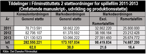 Når man sammenregner de totale støttebevillinger (både manuskript-, udvikling- og produktionsstøtte) i de to støtteordninger, er der ligeledes en betydelig skævhed. Konsulentordningen sidder på 62 % af støttemidlerne, Markedsordningen på kun 38 %, hvoraf romertalsfilm (fortsættelser som Far til fire – til søs, Min søsters børn i Afrika og Alle for to) belægger sølle 16,4 %.