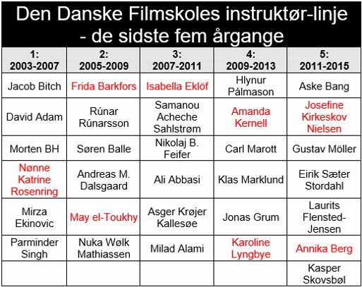 Når man kigger på kønsfordelingen blandt medlemmer af foreningen Danske Filminstruktører, og filminstruktøruddannelserne Den Danske Filmskole og Super 16, ser man kvinder være repræsenteret med henholdsvis sølle 33, 25 og 24 procent. Altså en langt fra ligelig kønsfordeling. Og næsten dobbelt så mange mænd som kvinder søgte ind på Den Danske Filmskole i 2015.