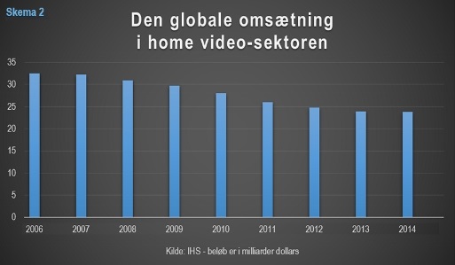 Hvis man isolerer filmindustriens indtægter og kun ser på home video-sektoren, ser man samme tendens som i musikindustrien. Det kan iagttages i nedenstående skema 2 for den globale omsætning i home video-sektoren (dvd, Blu-ray, streaming og vod). Tallene er leveret af det velrenommerede engelske analyseinstitut IHS.