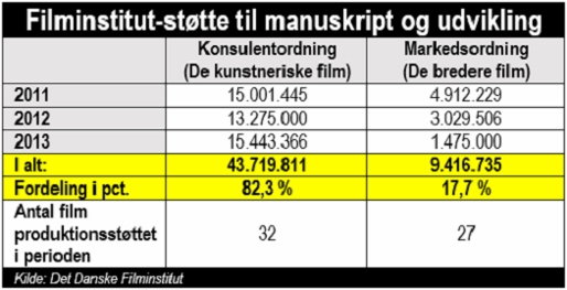 Som det kan ses i nedenstående skema er 82,3 % af støtten til manuskript og udvikling i de to ordninger blevet brugt på konsulentordningen, hvorimod filmene i markedsordningen har måttet nøjes med sølle 17,7 %.