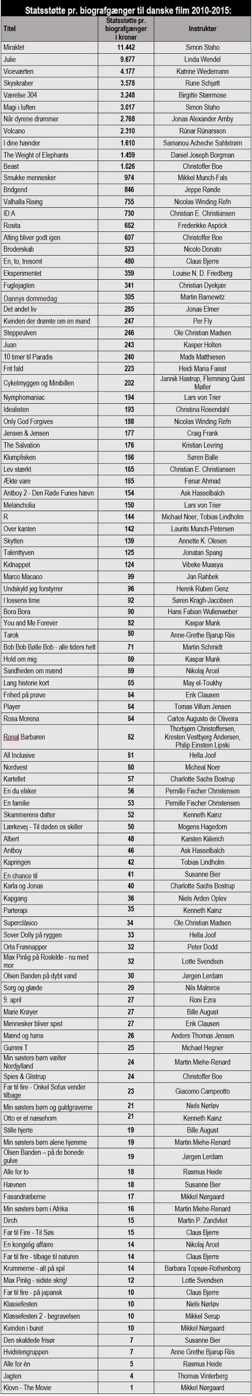 Her er en liste over, hvad staten har givet hver enkelt dansk biografgænger i baglommen på de enkelte film gennem de seneste fem et halvt år. Beløbene, som de enkelte film har været i stand til at tilbagebetale til staten, er naturligvis fratrukket.
