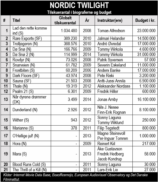 Spydspidsen i Nordic Twilight er svenske Tomas Alfredsons Lad den rette komme ind, helt tilbage fra 2008. Filmen karakteriseres som moren til bølgen og blev set af over en million biografgængere globalt. Sågar fik Lad den rette komme ind en amerikansk genindspilning, Let Me In fra 2010, som lykkedes at fordoblede originalens globale tilskuerantal i biograferne.