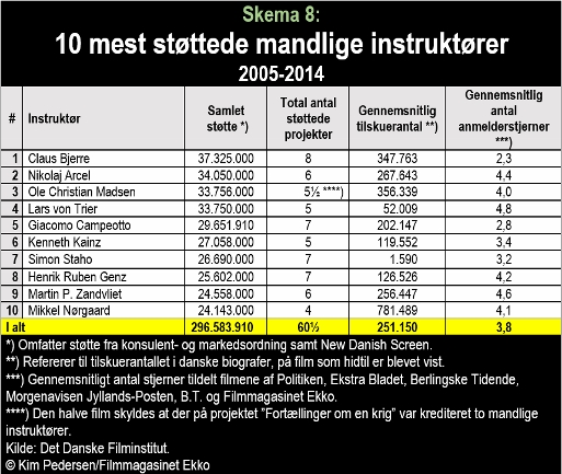 Skema 7 og 8 viser top ti over de mest støttede danske filminstruktører i perioden 2005-2014 fordelt på kvindelige og mandlige.