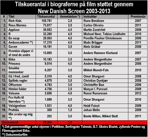 Tyve New Danish Screen-film – sytten spillefilm og tre dokumentarfilm – er i årene 2003-2013 blevet vist i biograferne. De er i alt blevet støttet med kr. 85,1 mio. og har samlet tiltrukket sølle 381.194 tilskuere – nogenlunde det samme som en enkelt Far til Fire-film.