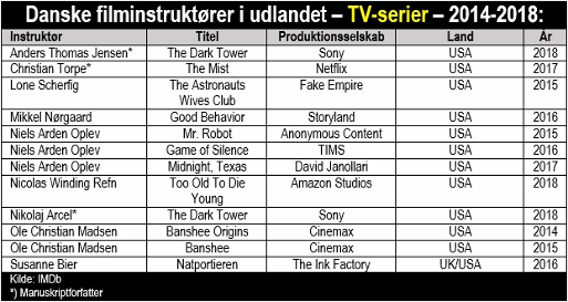 Men hvad er det egentlig, at det danske A-hold af filminstruktører laver i udlandet? Ifølge Det Danske Filminstituts konstituerede direktør, Claus Ladegaard, er svaret enkelt: De laver tv-serier!