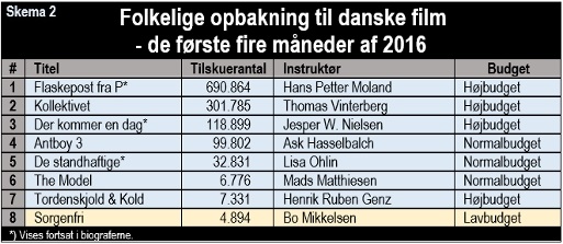 Det nye er, at premierekalenderen nu bugner af lavbudgetfilm. Se skema 1 herunder. At publikums forventninger til underholdning på det store lærred ikke imødekommes af lavbudgetfilm, kan ses i skema 2.