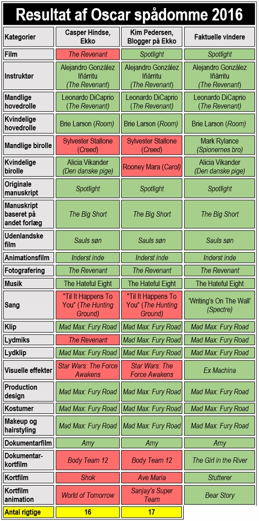 Men i bedste film-kategorien blev fårene skilt fra bukkene. Jeg vurderede man ikke ville kunne præmiere The Revenant, da filmen end ikke havde opnået en bedste manuskript-nominering. Mit gæt på Spotlight i den vigtigste kategori ramte til gengæld plet.