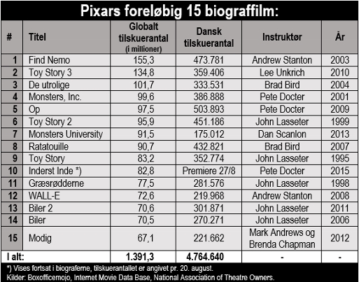 Succesen er da heller ikke udeblevet. Knap 1,4 milliarder biografgængere har globalt set de foreløbigt femten film, der er produceret af Pixar. Det samlende tilskuerantal til studiets film i Danmark andrager 4,7 millioner.