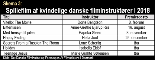 Den 2. januar 2017 udbasunerede Berlingske, at der kun ville være tre film af kvindelige, danske filminstruktører i hele 2017. Producenten Meta Louise Foldager Sørensen kaldte det ”decideret pinligt”, og Nanna Frank Rasmussen, daværende formand i Women in Film and Television, mente, at det var ”deprimerende”.