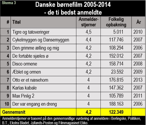 I skema 1 er alle danske børnefilm i 2015 oplistet. De forekommer nærmest, som om anmeldernes vurdering er direkte omvendt proportionelt med den folkelige opbakning.