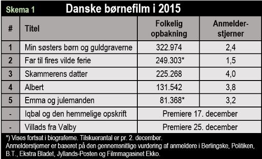 I skema 1 er alle danske børnefilm i 2015 oplistet. De forekommer nærmest, som om anmeldernes vurdering er direkte omvendt proportionelt med den folkelige opbakning.