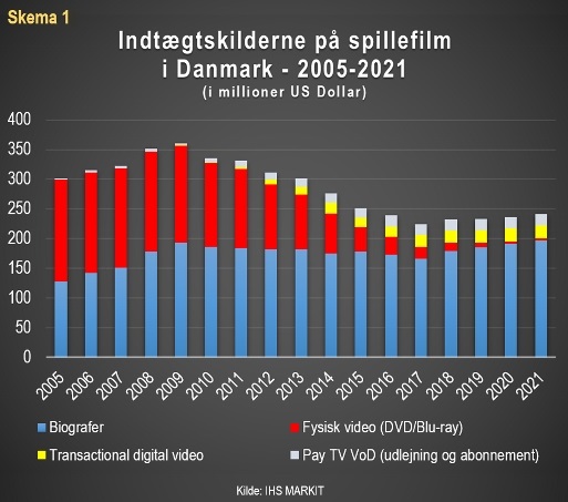 Nedenstående skema 1, udarbejdet af det anerkendte engelske analyseinstitut IHS Markit, viser indtægtskilderne på spillefilm i Danmark fra henholdsvis dvd, Blu-ray, de digitale tjenester og biograferne. Perioden er 2005-17 samt en forudsigelse af de næste fire år.