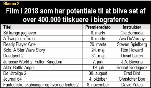 Hele ti film har i 2018 potentialet til at nå over de 400.000 tilskuere, altså den type film, som Filminstituttet savnede i 2017 og mener er tegn på ændrede medievaner. Se skema 2 nedenstående.