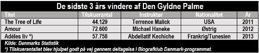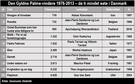 Den mest sælgende film tiltrak 581.059 tilskuere i Danmark, den mindst sælgende sølle 719. Så en Guldpalme er absolut ingen garanti for stort tilskuerantal i Danmark. Eneste garanti, der er ved at vinde Den Gyldne Palme, er vid udbredelse. Samtlige Palme-vindere er blevet vist i de danske biografer.