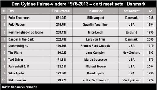 Danskerne foretrækker selvfølgelig danske Guldpalme-vindere. Der har i perioden været Pelle Erobreren, Den gode vilje og Dancer in the Dark. Disse tre film er gennemsnitligt blevet set af 253.323 tilskuere i de danske biografer.
