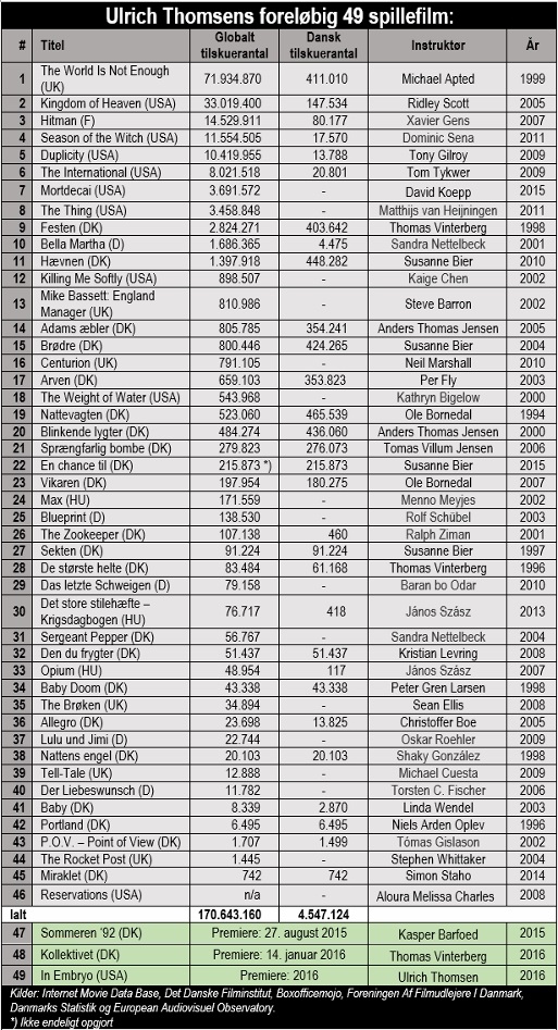 51-årige Ulrich Thomsen har medvirket i hele 49 spillefilm, hvor af de tre endnu ikke har haft premiere. Ud over spillefilmene har skuespilleren også medvirket i elleve kort-, seks tv-, en dokumentar- og en eksperimentalfilm. For slet ikke at tale om de fjorten tv-serier, som også har været velsignet med Thomsens medvirken.