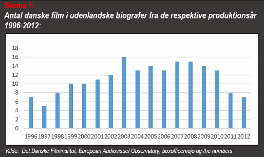 I perioden 1996-2012 – sytten år – er ikke mindre end 191 danske spillefilm, ud af en total produktion på 491 film, blevet vist i kommercielle udenlandske biografer.