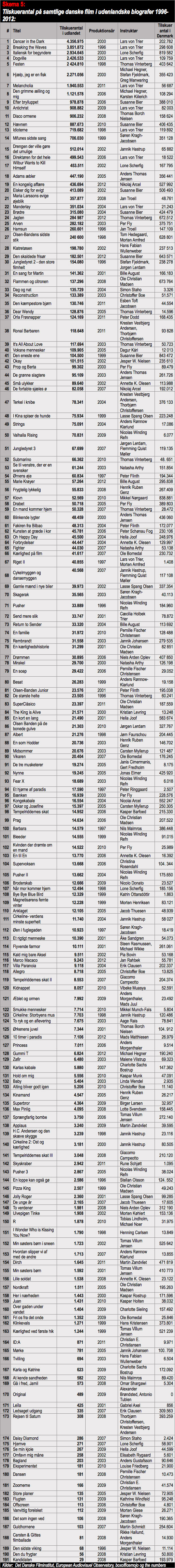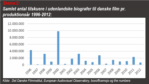I skema 5, allernederst i denne undersøgelse, kan man finde tilskuerantal på samtlige danske film i udlandet i perioden 1996-2012. Den mest sete danske film i årene 1996-2012 var – som nævnt - Dancer in the Dark (2000) med 4,3 mio. tilskuere og om end det er et flot resultat, skal man bemærke - inden vi istemmer ”We are the Champions” - at den svenske Mænd der hader kvinder (2009) blev set af 9,8 mio. uden for hjemlandet og franske De urørlige (2011) 20,7 mio. Vi befinder os nok ofte i superligaen, når priserne skal uddeles, men tilskuermæssigt er vi kun i 1. division.