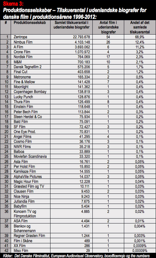 I nedenstående skema 3 fremgår det, at Zentropa og Nordisk sidder på 71,2 % af det udenlandske marked. A Film har en markedsandel på 11,2 % og Nimbus Film 12,4 %. Med andre ord repræsenterer disse 4 selskaber hele 94,8 % af markedet.