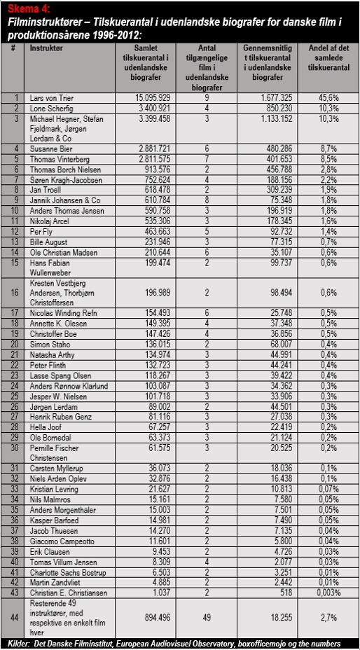 I nedenstående skema 4 ses det samlede udenlandske tilskuerantal for de respektive danske instruktører i perioden 1996-2012.